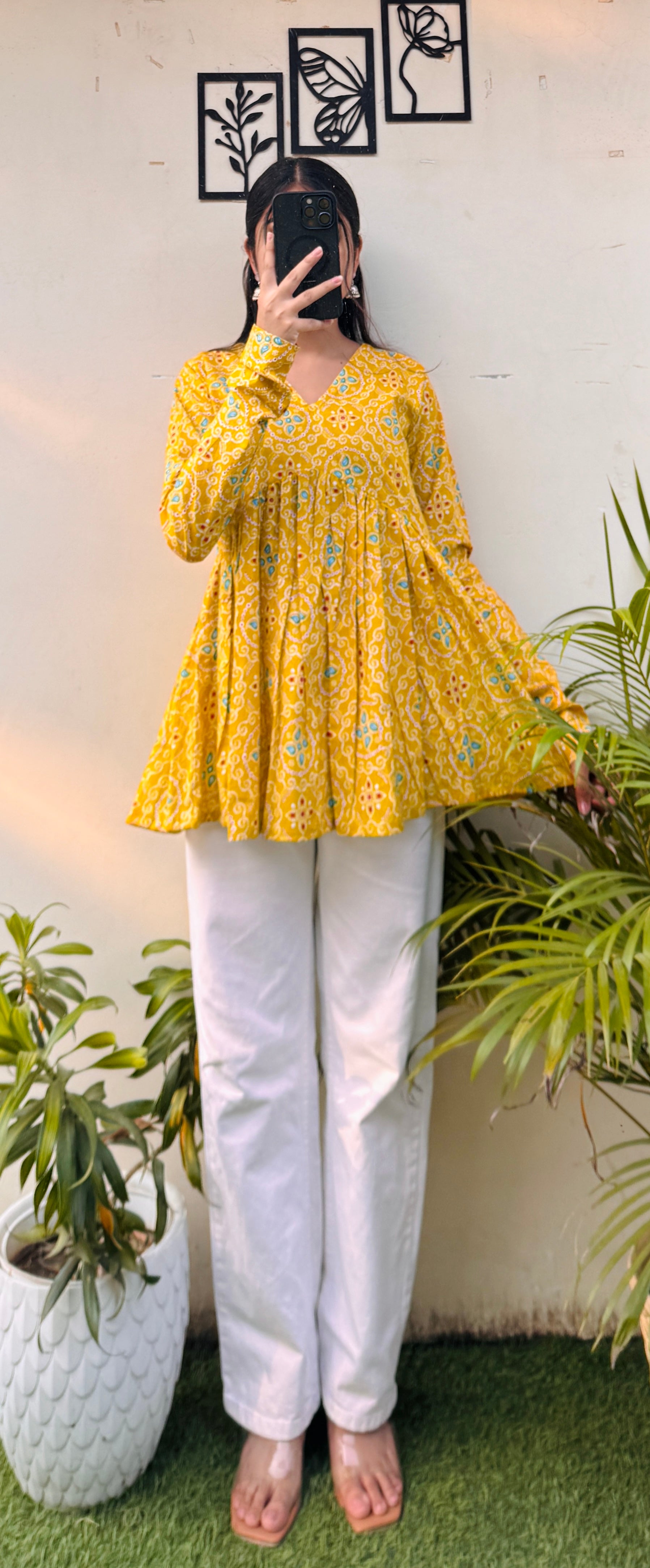 Cotton Yellow Flared Printed Aliacut Peplum Top